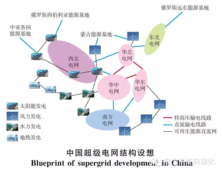 以中国现有的高压交流输电网为骨干,将华中、华东和华北电网作为特高压交流电网系统的交汇中心,通过高压直流输电线路,与全国各地的大型交流电网联合形成坚强的电力系统网架结构。利用VSC-HVDC技术将川、滇、藏等西南地区的水能、“三北”地区丰富的太阳能和风能、东部沿海地区丰富的风能汇集并连接成多个区域直流电网,减小新能源发电的间歇性及不稳定性;再进一步利用换相高压直流输电(LCC-HVDC)技术及直流电压变换(DC/DC)技术将区域直流电网输出的大规模电力送往负荷集中的中东部地区,形成大型多端直流电网或网络状高压直流输电网。同时,开发中国两广(广东、广西)地区的风能、石油和天然气等天然能源,建设成直流输电工程,为沿海高负荷地区供电,实现了能源贮藏和能源消耗自给自足。甚至通过背靠背直流工程或远距离高压直流输电工程,同具有廉价丰富电能的邻邦地区的能源基地电网互联,如与中国接壤的蒙古、位于中国东北方的俄罗斯远东地区、中国西北方的西伯利亚地区及其他中亚国家通过合作,优化资源配置,合理共享资源。
